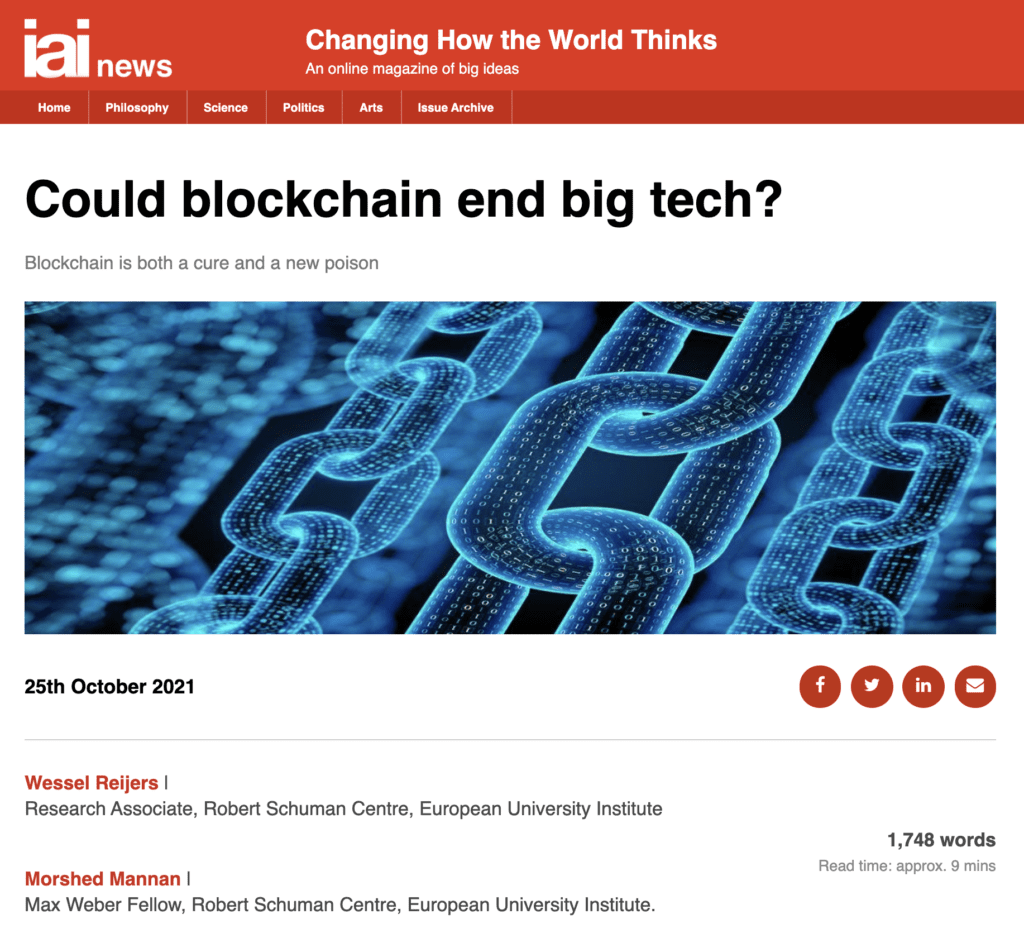 Reijers, W., Mannan, M. (2021) “Could Blockchain end Big Tech?”, in IAI.TV. 25 October 2021.